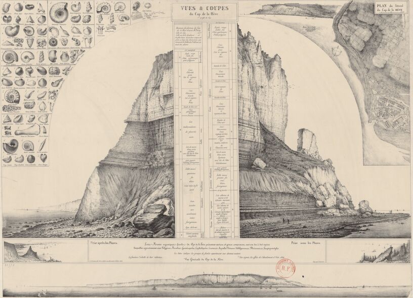 En 1837, Charles-Alexandre Lesueur revient en France et s’installe à Sainte-Adresse. Mais le pays a bien changé. Les troubles politiques à répétition l’ont affaibli et il tente de rattraper son retard industriel face à ses rivaux anglo-saxons. Témoin de cette époque agitée, sa commune du Havre s’est profondément transformée. Il s’efforce de faire connaître ses impressions d’Amérique dans un pittoresque ouvrage richement illustré, dont la plupart des planches se retrouveront plus tard au Muséum d’histoire naturelle du Havre, mais ne seront publiées qu’en 1904 lorsque l’historien et ethnologue Ernest-Théodore HAMY les présentera en partie dans l’annexe de « Les Voyages du naturaliste Ch.-Alex. Lesueur dans l’Amérique du Nord ». Lesueur est toujours aussi actif, réside principalement à Paris mais éprouve régulièrement le besoin de se rapprocher des siens et de la Normandie. Il reprend les études sur la géologie et la paléontologie de la région havraise qu’il avait initiées avant 1815 et offre au grand public, en 1842, une coupe sagittale de la falaise au nord du Havre, représentant la stratigraphie et la paléontologie du cap de la Hève.